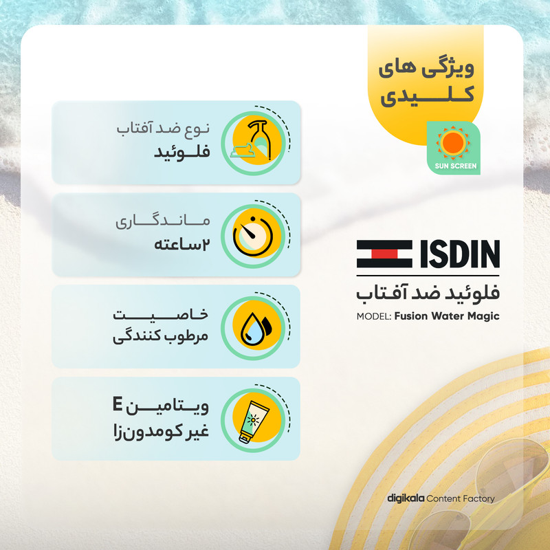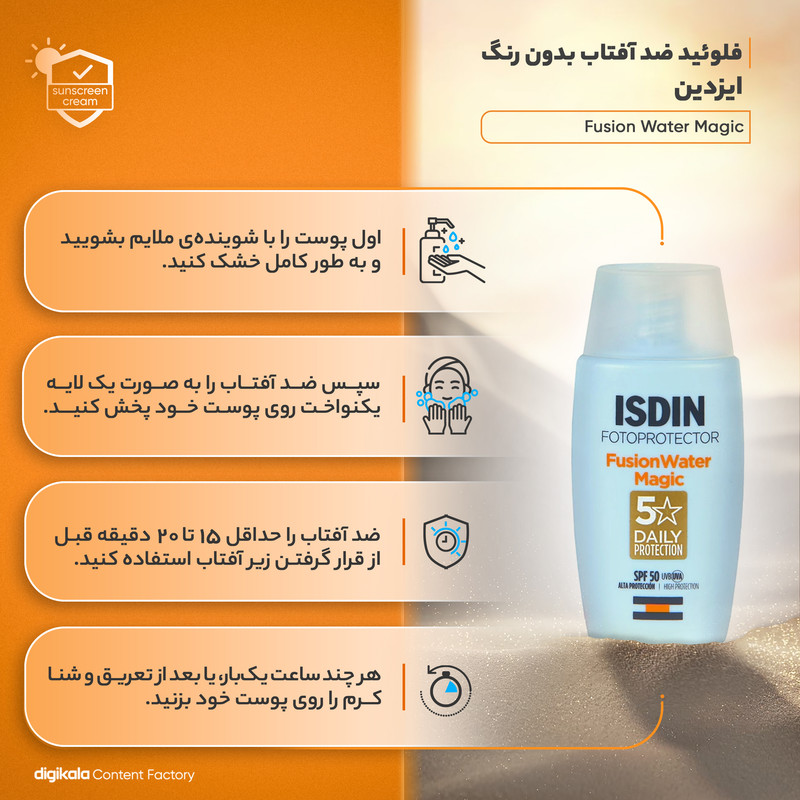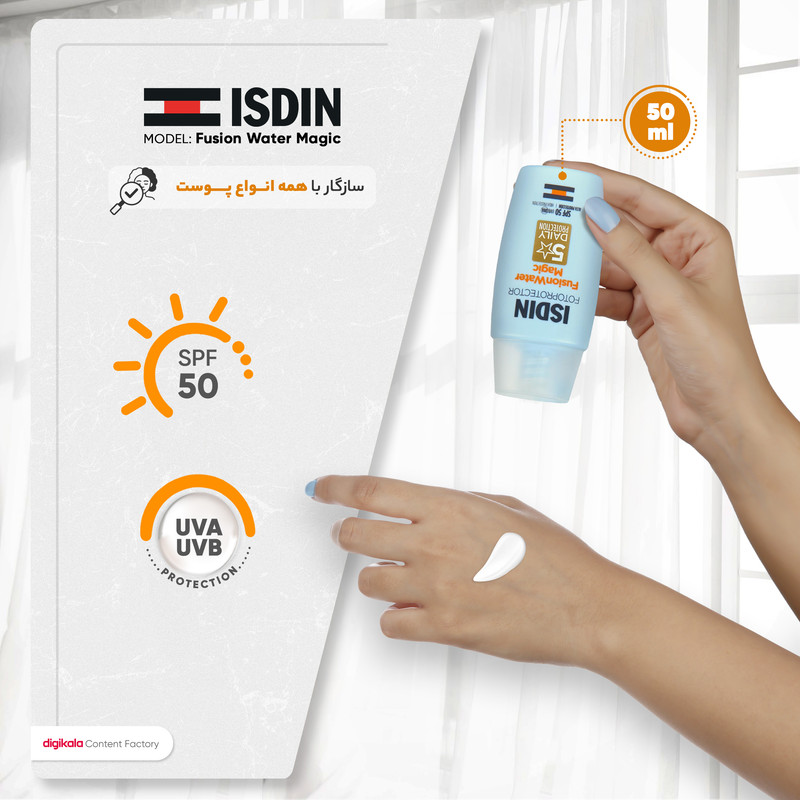 با فیوژن واتر MAGIC SPF50 از پوست خود محافظت کنید. به راحتی با پوست ترکیب می شود و محافظت بالایی در برابر اشعه های خورشید دارد. همچنین خاصیت مرطوب کنندگی و اثر آنتی اکسیدانی برای پوست ایجاد می کند. به سرعت جذب پوست میشود و اثر چربی روی پوست باقی نمی گذارد و چشم را تحریک نمی کند. این محصول غیر کومدون زا و بدون چربی نیز میباشد.