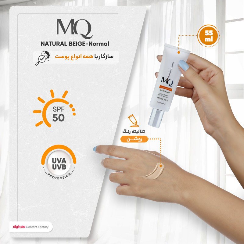 محصولات MQ ساخته شده از مواد با کیفیت می باشد. این محصولات در یکی از معتبرترین لابراتوارهای فرانسه و زیر نظر اساتید فن در صنعت مراقبت از پوست و مو فرموله شده است. این کمپانی کرم های ضد آفتاب خود را روانه بازار کرده است این کرم ها ساخته شده از مرغوبترین و جدیدترین مواد اولیه که دارای حداکثر حفاظت در برابر پرتوهای مضر آفتاب هستند. این محصولات دارای ساختاری سبک بوده نرمی و لطافت را به پوست بازمی گرداند. یکی از این محصولات ، کرم ضد آفتاب نرمال SPF 50 است. که در سه رنگ صورتی، بژ طبیعی، بژ روشن موجود است. این ضد آفتاب مناسب پوست های نرمال و خشک است که در مقابل تعریق مقاوم است همچنین یک پوشش دهنده و محافظت کننده قوی در برابر اشعه های مضر UVA و UVB به حساب می آید از آنجایکه حاوی ترکیبات مرطوب کننده قوی است لذا از چروک پوست ناشی از آفتاب و بالا رفتن سن پیشگری خواهد کرد. جهت استفاده نیم ساعت قبل از قرار گرفتن در معرض اشعه آفتاب روی پوست تمیز مالیده شود و هر دو ساعت یکبار آن را تجدید کنید.