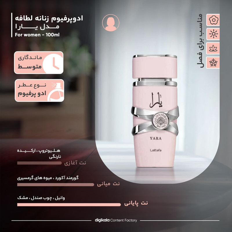 ادو پرفیوم زنانه لطافه مدل یارا با حجم 100 میلیلیتر، عطری است که با نتهای آغازی از هلیوتروپ، ارکیده و نارنگی، حسی از طراوت و شادابی را به ارمغان میآورد. نتهای میانی شامل گورمند آکورد و میوههای گرمسیری، ترکیبی از شیرینی و گرما را به دل مینشاند که تداعیکننده لذتهای خوراکی و فراوانی طبیعت است.