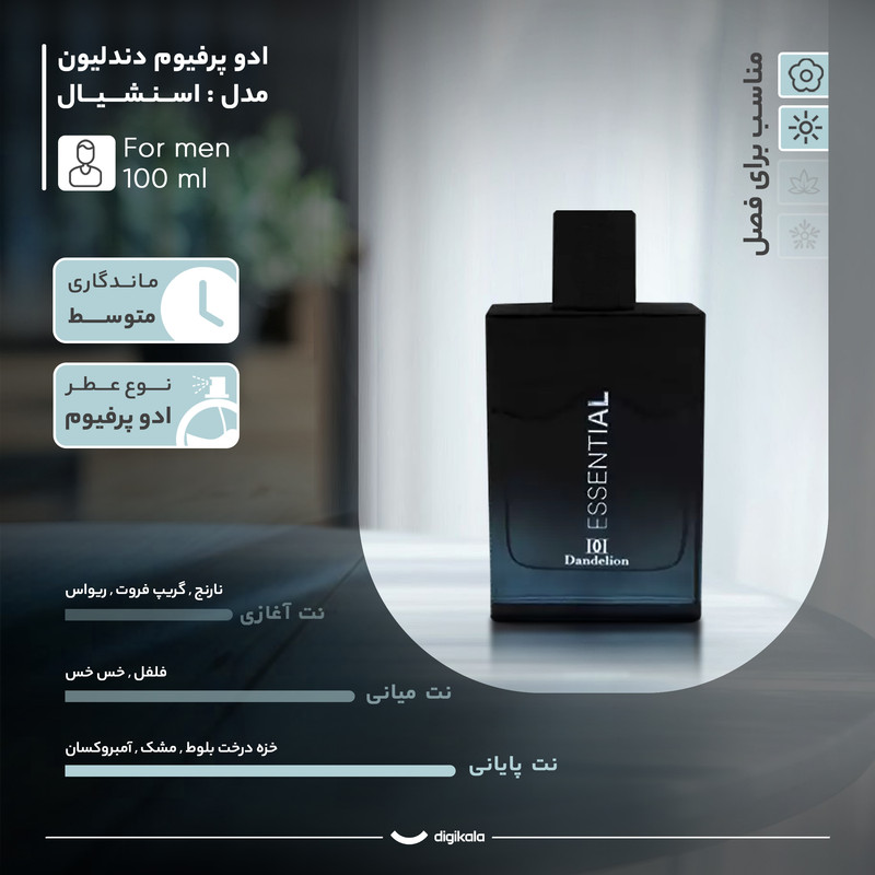 ادو پرفیوم مردانه دندلیون مدل اسنشیال با حجم 100 میلیلیتر، انتخابی عالی برای مردانی است که به دنبال عطری خنک و دلپذیر برای روزهای بهاری و تابستانی هستند. این عطر با طراحی شیک و مدرن، حس خاصی از جذابیت و اعتماد به نفس را به شما منتقل میکند. نتهای آغازین شامل نارنج، گریپ فروت و ریواس هستند که طراوت و انرژی را به ارمغان میآورند و فضایی شاداب و دلنشین را ایجاد میکنند. در نتهای میانی، ترکیبی از فلفل و خس خس به عطر عمق و جذابیت بیشتری میبخشد و حس شیک و فریبندهای را به شما منتقل میکند. در نهایت، نتهای پایانی با خزه درخت بلوط، مشک و آمبروکسان، گرما و ماندگاری مناسبی را به عطر اضافه میکنند و تجربهای ماندگار و دلپذیر را برای شما رقم میزنند. با پخش بوی متوسط و ماندگاری مناسب، این ادو پرفیوم برای استفاده روزمره و مهمانیها طراحی شده و به خوبی در فصول بهار و تابستان خود را نشان میدهد. با دندلیون اسنشیال، شما میتوانید در هر جمعی بدرخشید و با بوی خاص و دلپذیر خود، جذابیت و شخصیت خود را به نمایش بگذارید. این عطر، بهترین همراه شما در هر لحظه خواهد بود و حس خاصی از شیک بودن و اعتماد به نفس را به زندگی شما میآورد.