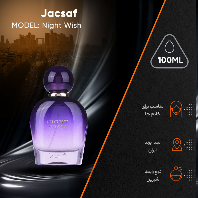 «ژک ساف» (Jacsaf) که به خاطر تولید و فروش خوب عطرهای جیبیاش شهرت خاصی دارد، در سال 2015 یکی از عطرهای خودش را برای بانوان معرفی کرده است. این ادو پرفیوم 100 میلیلیتری «نایت ویش» (Night Wish) نام دارد. نایت ویش با بوی شیرین و زنانهاش برای تمامی فصول سال پیشنهاد میشود. بطری این عطر بسیار خوشدست و ظریف ساخته شده است. شیشه از پایین به بالا پررنگتر میشود. پس هرچه از زمان اسپری کردن این عطر بگذرد، بوی شدیدتری را احساس خواهید کرد. روی شیشهی بنفشرنگ این عطر، نام نایت ویش که با رنگ نقرهای چاپ شده را مشاهده میکنید. روی پایهی بطری، نشان تجاری Jacsaf را مشاهده میکنید. در بطری با شکل کروی و کوچکش بهخوبی روی حلقهی طلاییرنگ دور گردن بطری سوار شده است. بهمحض اولین اسپری از ژک ساف نایت ویش روی پوست و محل نبضتان متوجه بوی پرتقال ماندارین و نارنج خواهید شد. این ترکیب مرکباتی و شیرین، شادی و طراوت عجیبی را در شما و کسانی که بوی این عطر را استشمام میکنند ایجاد میکند. پس از مدتی این نتهای جای خود را به نتهای میانی خواهند داد. نتهای میانی از ترکیب گلهای رز، یاسمین و صدتومانی ساختهشدهاند. بوی این نتهای گلی، اعتمادبهنفس و انرژی مثبت فراوانی را به شما هدیه میکند. پس از مدتی طولانی، این نتها جای خود را به نتهای پایانی خواهند داد. نتهای پایانی از ترکیب وانیل، گیاه جادویی پاتچولی و بادامسوخته تشکیل میشوند. این ترکیب تند، هیجان و انرژی را در شما به اوج خود میرساند. خرید عطر ژک ساف نایت ویش با توجه به شیشهی ظریف و زنانه، حجم 100 میلیلیتری، پخش بوی قوی و قیمت منطقی و نهچندان بالایش برای شما و کسی که این عطر را به او هدیه میدهید بسیار خوشحالکننده خواهد بود.