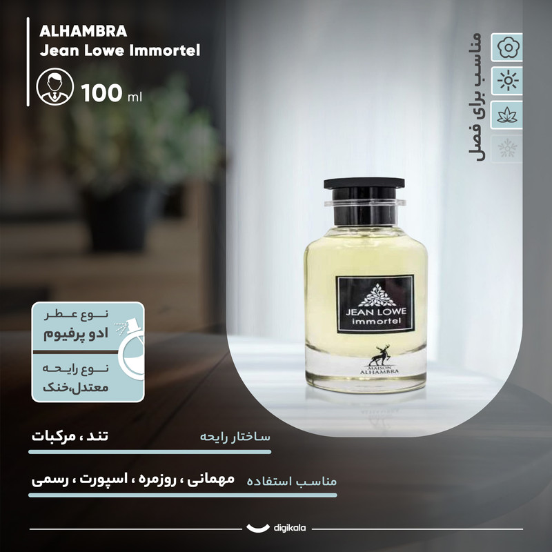 اگر به دنبال عطری هستید که در همان برخورد اول، تصویری از جذابیت، اعتمادبهنفس و وقار مردانه را در ذهن دیگران حک کند، ادو پرفیوم مردانه الحمبرا مدل جین لوو ایمورتل دقیقاً همان انتخابی است که باید به سراغش بروید. این عطر اماراتی با کیفیت ساخت فوقالعاده و رعایت استانداردهایی چون عدم استفاده از مواد حساسیتزا، نه تنها شما را مجذوب خود میکند، بلکه خیالتان را بابت سلامت پوست نیز راحت میسازد. جین لوو ایمورتل عطری است با ساختار رایحهای تند و مرکباتی که در ترکیب نتهای آن بازی ماهرانهای از خنکی و طراوت با عمق و ماندگاری بالا دیده میشود. نت آغازین با انفجاری از گریپفروت، زنجبیل و ترنج، حسی بیپروا و پرانرژی را القا میکند. پس از چند دقیقه، رایحهای میانی از نتهای آبی، رزماری، مریم گلی و شمعدانی ظاهر میشود و در نهایت، ترکیب آمبروکسان، عنبر و لابدانیوم در نت پایانی، ماندگاری و گیرایی خاصی به این رایحه میبخشد. این ادو پرفیوم ۱۰۰ میلیلیتری که در بطری شیشهای شکیل و مردانهای عرضه شده، با پخش بوی قوی و ماندگاری بالا، انتخابی ایدهآل برای استفاده روزمره، مهمانی، موقعیتهای رسمی و حتی استایلهای اسپرت محسوب میشود. از آنجایی که رایحهای معتدل و خنک دارد، برای سه فصل اصلی سال یعنی بهار، تابستان و پاییز مناسب است.