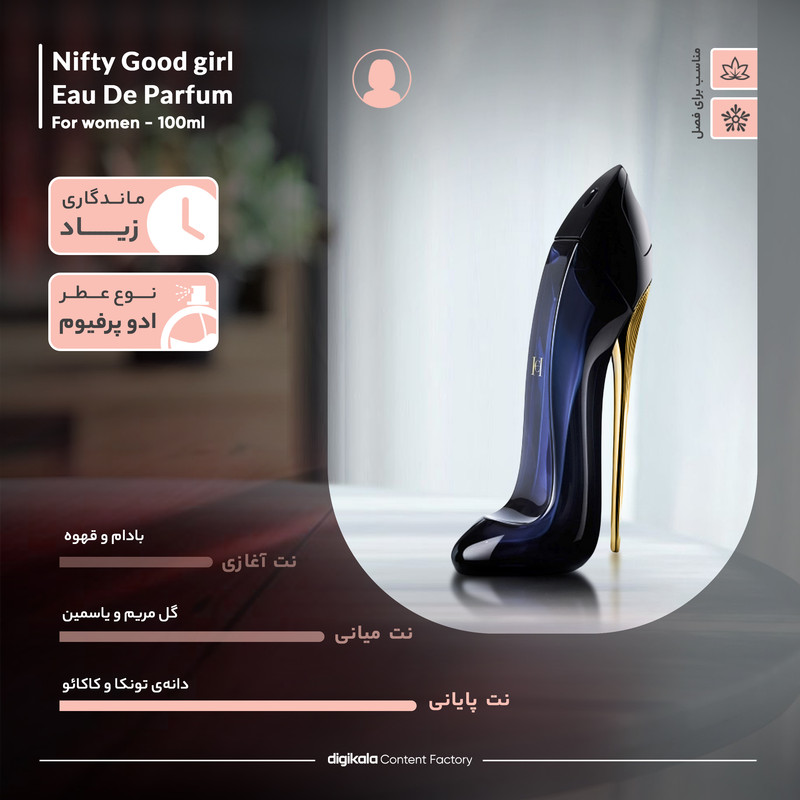 ادو پرفیوم زنانه نیفتی مدل GOOD GIRL، یک عطر پرطرفدار مخصوص خاصپسندان با بوی اغواکننده است که هنگام اسپری نمودن آن، رایحههای جادویی از خود به نمایش میگذارد که بوی بادام و قهوه در فضای اطراف پخش میشود. این ترکیب انرژی و هیجان را به شما هدیه میکند. پس از مدتی این نتها جای خودشان را به نتهای میانی میدهند. نتهای میانی از گل مریم و یاسمین ساخته شدهاند. بوی این گلها، انرژی مثبت را به شما هدیه میکنند. در ادامه شاهد جابهجایی نتهای میانی و پایانی خواهید بود. این نتهای پایانی از دانه تونکا و کاکائو تشکیل میشوند. بوی شیرین این ترکیب دوگانه، شادی و نشاط شما را بیشتر میکند. همچنین شیشه بسیار خاص و باکیفیت این مدل گودگرل در کنار سایر لوازم آرایشی، زیبایی آن را به رخ بیننده میکشد.
