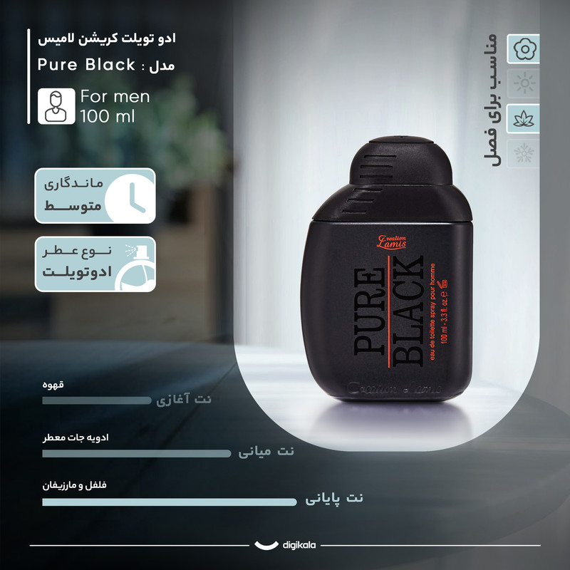 ادوتویلت مردانه کریشن لامیس مدل Pure Black با حجم 100 میلیلیتر، انتخابی خاص و جذاب برای مردانی است که به دنبال عطری تند و متمایز برای روزهای بهاری و پاییزی هستند. این عطر با طراحی شیشهای شیک و مدرن، حس خاصی از جذابیت و اعتماد به نفس را به شما منتقل میکند. نتهای آغازین این ادو تویلت با رایحه دلپذیر قهوه آغاز میشوند که حس گرما و انرژی را به ارمغان میآورد و فضایی شیک و متمایز را ایجاد میکند. در نتهای میانی، ادویهجات معطر به عطر عمق و جذابیت بیشتری میبخشند و حس شیک و فریبندهای را به شما منتقل میکنند. در نهایت، نتهای پایانی شامل فلفل و مارزیفان، گرما و ماندگاری مناسبی را به عطر اضافه میکنند و تجربهای ماندگار و دلپذیر را برای شما رقم میزنند. با پخش بوی متوسط و ماندگاری مناسب، این ادوتویلت برای استفاده روزمره و مهمانیها طراحی شده و به خوبی در فصول بهار و پاییز خود را نشان میدهد. با کریشن لامیس Pure Black، شما میتوانید در هر جمعی بدرخشید و با بوی خاص و دلپذیر خود، جذابیت و شخصیت خود را به نمایش بگذارید. این عطر، بهترین همراه شما در هر لحظه خواهد بود و حس خاصی از شیک بودن و اعتماد به نفس را به زندگی شما میآورد.