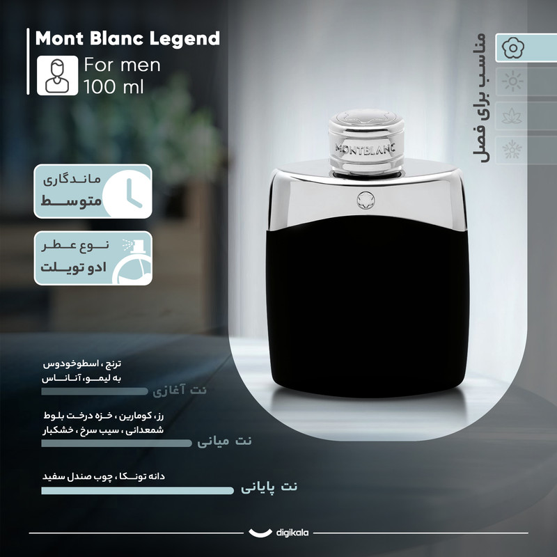 آقایانی که به رایحههای سنگین علاقه دارند، میتوانند از ادوتویلت فرانسوی «مون بلان» (Mont Blanc) مدل «لجند» (Legend) استفاده کنند. این ادوتویلت برای استفادهی روزانه تهیه شده است. در نظر اول، رنگ سیاه و طراحی لوکس و مینیمالیستی بطری نگاه شما را به خود خیره میکند. شانهها و در فلزی درخشان لجند که نام مون بلان روی آن حک شده است، از ویژگیهای مهم بطری این عطر به شمار میرود. بدون شک اگر دوستان شما این ادوتویلت کلاسیک را روی میزتان مشاهده کنند، متوجه اهمیت بالای عطر و ادوکلن نزد شما خواهند شد. برای خوشحالکردن دوستی که از زمان کودکی با هم بزرگ شدهاید، میتوانید مون بلان لجند را به او هدیه دهید. لجند در سال 2011 توسط عطرساز معروف Olivier Pescheux طراحی و ساخته شد. با اولین اسپری بوی اسطوخودوس، آناناس و نارنج بهسرعت در فضای اطراف شما پخش میشود. شادی و سرزندگی عجیبی که از این مخلوط سهگانه میگیرید، به اطرافیان شما هم منتقل میشود. پس از کمی آرامآرام، بوی گل رز و شمعدانی، سیب، خزه و میوههای خشک جایگزین نتهای قبلی میشود. این عناصر خنکی و شیرینی مطلوبی ایجاد میکنند. با گذشت زمانی از اسپری، رایحههای دانهی تونکا و چوب صندل برای ماندگاری بیشتر لجند روی محل نبض یا لباس شما وارد عمل میشوند. خرید عطر مون بلان Legend با توجه به شیشهی زیبا و حکم، حجم 100 میلیلیتری، پخش بوی قوی و برند شناختهشدهاش برای شما و کسی که این عطر را از شما هدیه میگیرد بسیار لذتبخش خواهد بود.