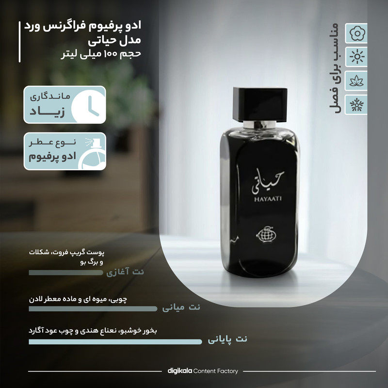 ادو پرفیوم فراگرنس ورد مدل حیاتی یکی از بهترین انتخاب ها برای افرادی است که دنبال یک عطر شیک و خاص هستند. این ادو پرفیوم با رایحه ای شگفت انگیز از پوست گریپ فروت، شکلات و برگ بو تشکیل شده است که با گذر زمان میان رایحه آن شامل روایح چوبی، میوه ای و ماده معطر لادن می شود. رایحه پایه این ادو پرفیوم نیز با بخور خوشبو، نعناع هندی و چوب عود آگارد، تازگی و جذابیت آن را تکمیل می کند. با استفاده از این ادو پرفیوم، شما می توانید به شیوه ای منحصر به فرد و با شخصیت عطری خاص را تجربه کنید که همه چشم ها را به سوی خود جلب خواهد کرد.