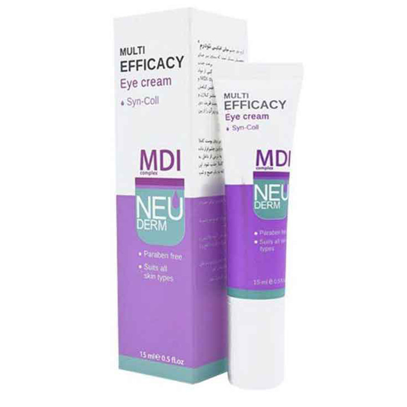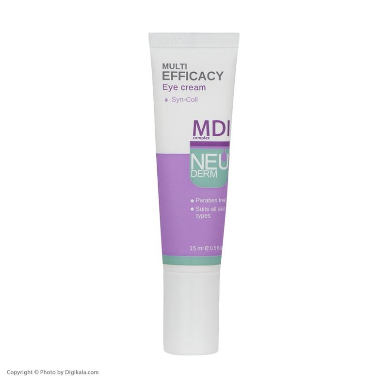 چشم بهعنوان یک عضو حساس بدن به جز حس بینایی در زیبایی چهرهی افراد هم نقش بسیار موثری دارد. پوست اطراف چشم، بسیار حساس و مستعد چروک است. در اثر خندیدن، اخمکردن یا جمعکردن چشم در برخورد با نور آفتاب، چین و چروک تشدید شده یا عمیقتر میشود؛ ازاینرو استفاده از یک کرم دور چشم در زمان مناسب، میتواند از به وجود آمدن آن جلوگیری کرده و زیبایی چشمها را حفظ کند. کرم دور چشم «نئودرم» (Neuderm) مدل «مولتی افیکیسی» (Multi Efficacy) با ترکیبات سین کول (Syn-Coll) و کمپلکس ام-دی-آی (MDI)، بدون احساس چربی، پوست دور چشم را ترمیم کرده و از بروز و عمیقشدن چروکها جلوگیری میکند. این محصول، کلاژن پوست را افزایش داده و با نفوذ به قسمتهای عمیق به ترمیم بافت پوست میپردازد. این کرم با بهبود گردش خون مویرگی در اطراف چشم، اثر استحکامبخشی خوبی بر پوست خواهد داشت. توصیه میشود که در اوایل بروز چینها و قبل از عمیقشدن چروکها به طور منظم استفاده شود. این محصول برای انواع پوست مناسب است و علاوهبر خاصیت ضدچروک، به رفع سیاهی و پف زیر چشم هم کمک میکند. این کرم در تیوپی به حجم 15 میلیلیتر عرضه شده که فاقد پارابن است؛ به همین علت آلرژیزا نخواهد بود. پارابنها گروهی از محصولات شیمیایی استند که از ایجاد باکتری جلوگیری کرده و باعث افزایش طولعمر محصولات میشوند؛ اما برای پوست و بدن آسیبرسان و مضرند. خرید و استفاده از این کرم از پیری زودرس چشمتان جلوگیری کرده و زیبایی آن را حفظ خواهد کرد.