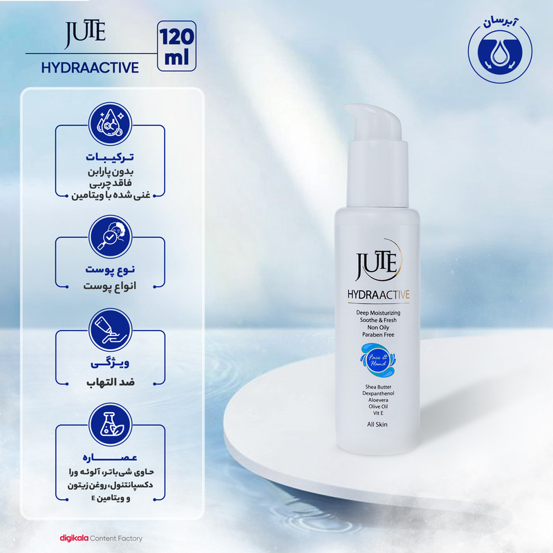 کرم آب رسان دست و صورت ژوت، یک نرم کننده عالی برای آبرسانی سطح پوست است. بافت این کرم بسیار سبک و سرعت جذب آن بالاست که موجب نفوذ در عمق پوست شده و تاثیری بیشتر بر پوست دارد. ترکیبات این محصول عبارتند از شی باتر، دکسپنتنول، روغن زیتون، ویتامین E و آلوئه ورا که همگی خاصیتی ضد التهابی و تسکین دهنده دارند. کرم آب رسان دست و صورت ژوت، کرمی با بافت غیر چرب می باشد که نرم کننده سطحی پوست است و با افزایش مواد جاذب آب و ماندگاری بالای رطوبت در پوست، به تقویت سیستم محافظتی سطح پوست کمک می کند. به دلیل نداشتن چربی و پارابن این محصول برای انواع پوست حتی پوست های چرب و حساس نیز مناسب است. بسته بندی این محصول به شکل پمپی می باشد که برای روی میز آرایش بسیار مناسب است. بسته بندی تیوپی کرم آب رسان دست و صورت ژوت، که برای حمل در کیف مناسب است